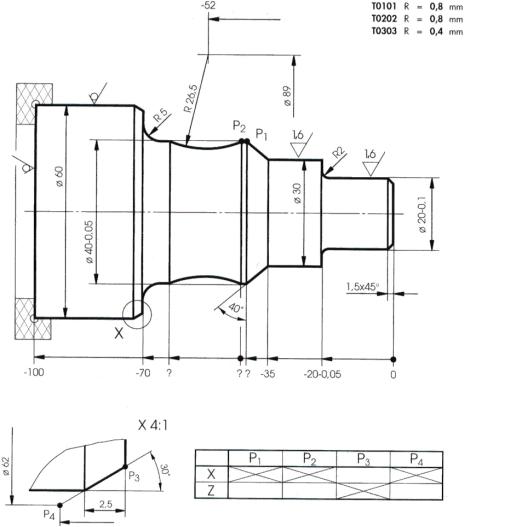 加工如图所示零件,毛坯尺寸为65×105mm,材料为45#钢。仔细阅读图纸,计算出基点坐标,并编写零件的加工程序。