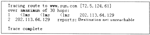 在一台主机上用浏览器无法访问到域名为www.sun.com的网站,并且在这台主机上执行tracert命令时有如下信息: