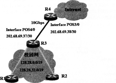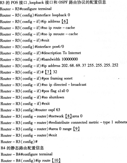 如下图所示,某校园网用l0Gbps的POS技术与Internet相连,POS接口的帧格式是SONET。路由协议的选择方案是校园网内部采用0SPF动态路由协议,校园网与Internet的连接使用静态路由协议。另外,还要求在R3上配置一个loopback接13,接l3的IP地址是192.167.166.6。