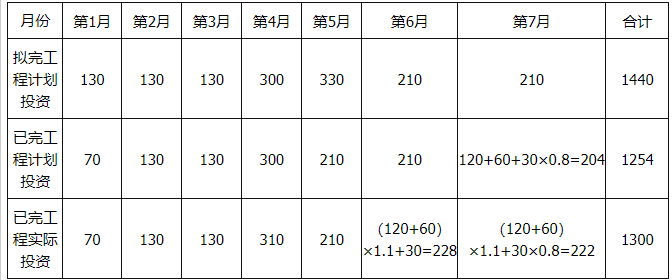 事件3:D、E工作受A工作的影响,开始时间也推迟了1个月,由于物价上涨原因,6~7月份D、E工作的实际完成投资较计划完成投资增加了10%。D、E工作均按原持续时间完成,由于施工机械故障,J工作7月份实际完成计划工程量的80%,J工作持续时间最终延长1个月。