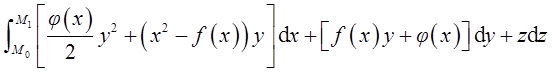 确定函数f(x),φ(x),使曲线积分∫L[φ(x)y2/2+(x2-f(x))y]dx+[f(x)y+φ(x)]dy+zdz对于任何闭曲线L的积分都等于0,且f(0)=-1,φ(0)=0,试计算沿曲线L从点M0(0,1,0)到M1(π/2,0,1)的曲线积分