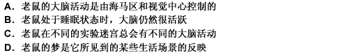 查看答案研究人员让老鼠待在不同的迷宫中,并对它们大脑中海马区和视觉中心的活动情况进行了测量。结果显示,当所处的迷宫发生变化时,老鼠大脑中上述区域的活动情况也发生了变化。之后,当老鼠处于睡眠状态时,科学家们又对它们的大脑进行了重复测量。结果显示,老鼠大脑中所反映出的“生活场景”恰好是它们在迷宫中奔跑时所看到的。研究人员从中得到的最终结论应该是()。