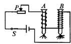 D.向右移动滑片P,电磁铁A、B磁性都减弱